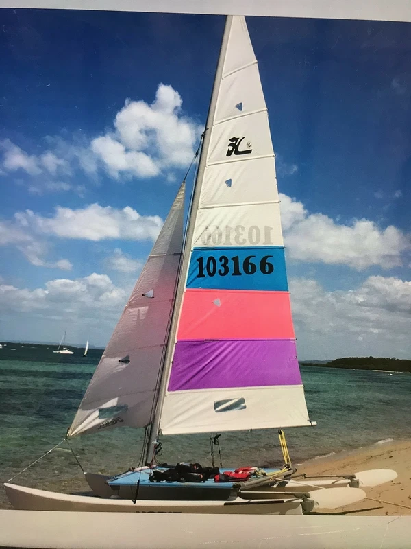 One dismantled can use one as parts boat or sail both2 Tramps 1 solid 1 mesh2 sets of Racing Sails with intact battens clear windows wind luff indicators and sail bags Tequila Sunrise Paradise Colors1 Set of Wind sails White with additional Intensity Jib and clear window2 Masts black anodized2 Sets Racing. Welcome to Hobies For Sale. We will get back to you as soon as possible.